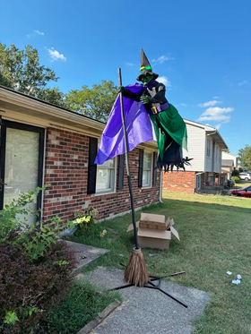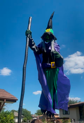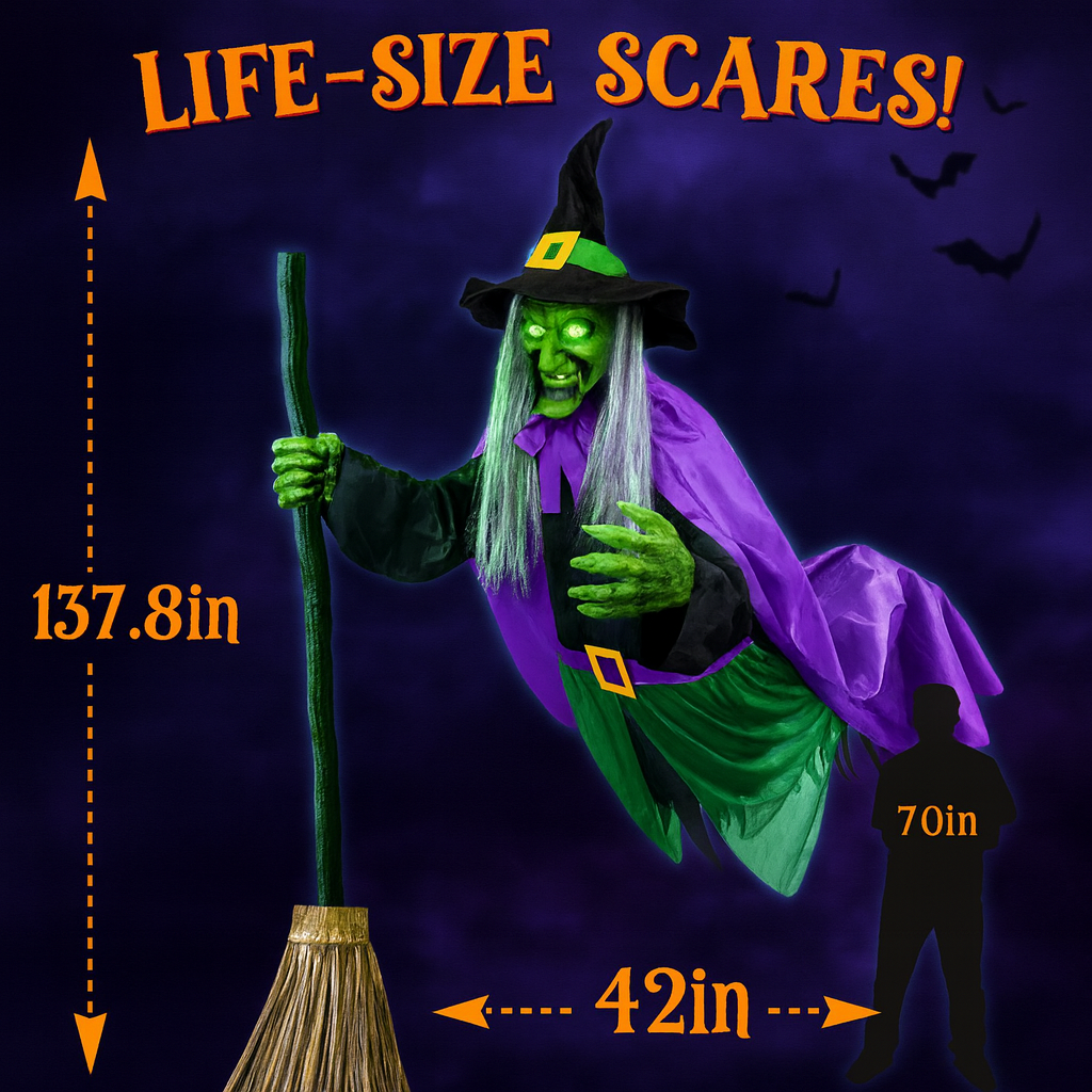 A 11.5 ft tall witch that flies, screams, lights up, and comes alive when people get close.Guaranteed scares for kids, neighbors, and trick-or-treaters.