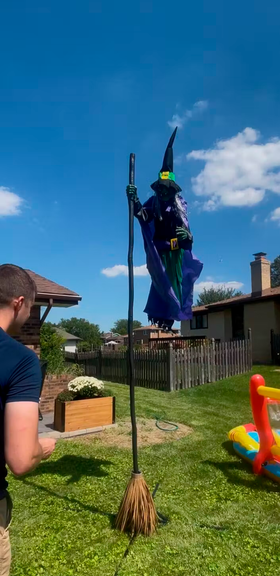 👉 The Flying Witch is built for convenience. She comes with a ground stake system and assembles in minutes. Pop in 3 AAA batteries, stake her into your yard, and she’s ready to terrorize the neighborhood. No tangled wires, no expensive setup, no headaches. Just instant scares.